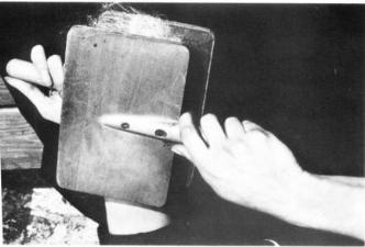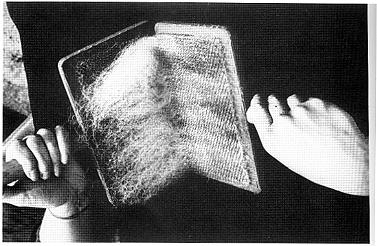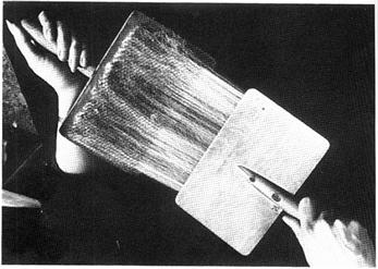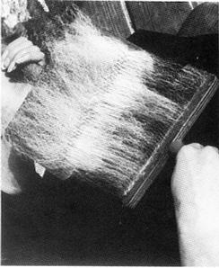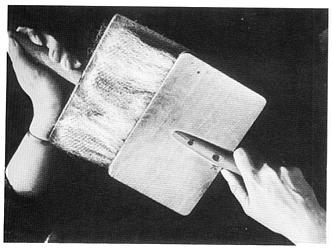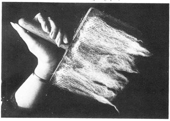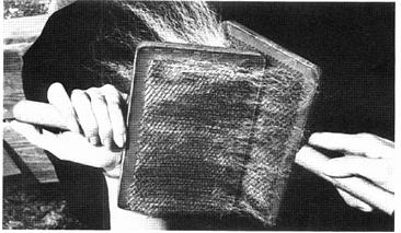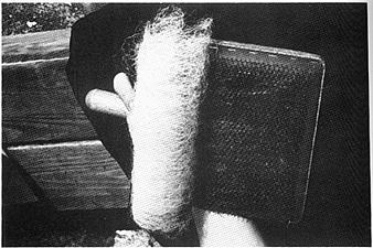 Figure 22 below gives step-by-step instructions in carding. The pictures are taken from Dalby and Christmas [1984]. Be very careful when you're first carding, as it is all too easy to rake your knuckles with the sharp teeth of the carder. I seriously suggest you stick a bandaid over the first knuckle of each hand when you begin carding—I gave myself a couple of very nasty scrapes before my skill improved.