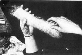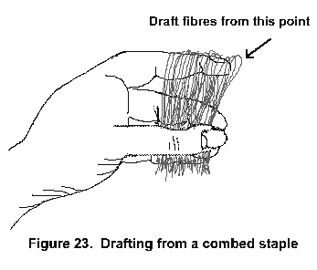 To draft out fibres from a combed staple, fold it over the forefinger of your left hand and hold the ends between your thumb and your other fingers (see Figure 23). Draft the fibres out from the edge of the middle of the staple where is lies over your forefinger, and you will get a nice smooth strand. If you try to draft from the ends of the staple, they will clump up and tangle. This is known as the "folded lock" technique [Dalby and Christmas, 1984].