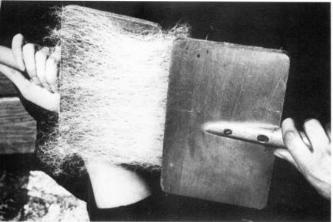 You now have a spindle with ten or so centimeters of thread free at the top, secured at the notch. The wool you will be about to spin will be in one of three forms: a teased mass, a rolag, or a combed staple. A teased mass is exactly what it sounds like—a fluffy lump of wool which has been thoroughly pulled apart to separate the fibres, untangle them from dirt and burrs, and remove knots. A rolag is a cylinder of light, fluffy wool made by rolling carded wool off a carding comb (carder), a process described in the last section. A combed staple is a staple of wool—a lock of fibres which have all grown up closely together and are compressed together at the tip—which has been gently brushed apart so that any shorter fibres have been removed and the strands all lie parallel to each other (see Making a Combed Staple).