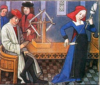 First and foremost, wool, and second, flax (which produces linen). These were the fibres most commonly spun in our period. Hemp, stinging nettle fibres, and cotton were also spun. Ramie, from nettle fibres, is like a coarse linen and is very hard-wearing. Cotton was spun in steadily increasing amounts through the later half of our period, particularly in southern Europe, although I have the impression it was only spun for domestic consumption quite late in period. Finally, of all odd things, asbestos was also spun into thread and woven, although perhaps fortunately for the already-precarious health of the medieval woman, this was purely as a novelty and was scarcely common!