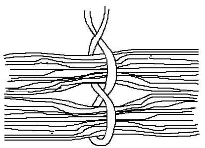 When the yarn is all wound, you need to tie the skein in at least four places to prevent it tangling. Use a figure-8 tie as shown in Figure 12 below; this helps keep the strands separate [Dalby and Christmas, 1974].