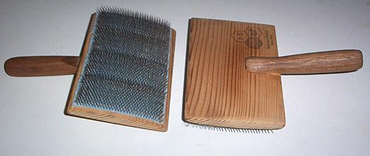 For making combed staples, I use an old hairbrush. Don't pick one of the kind that has lumps on the ends of the bristles. Tease the staple lightly without separating the bottom end, then hold this in one hand against your thigh and brush out the top end. When it is all nicely separated, hold the top end down and brush out the bottom end. You will end up with a rectangular lump of parallel fibres, with most of the shortest fibres stuck in the brush.