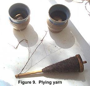 Now start the spindle spinning, but in an anticlockwise direction, ie, the yarn will have a S-twist. Slowly (so you don't break the thread) pull out more thread from the balls until your spindle is just off the floor. Give the spindle another vigorous twist and let it spin for a few seconds. Check that the twist is good enough (see below), wind up the yarn onto the spindle, dress the spindle as for ordinary spinning, and continue. Figure 9 shows a spindle full of plied wool and two of Master Alex's cups containing thread wound on wooden cotton reels.
