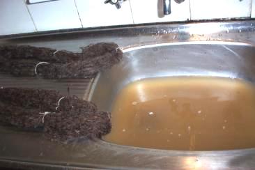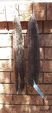 Figures 13 and 14 show how amazingly dirty my black wool was, even after vigorous brushing, and a couple of skeins hanging up to dry from wire hooks with my highly ersatz skein-weights.