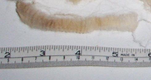 A staple is a lock of fibres which have grown up as a single clump and are caught together at the tip (usually with dirt :-( ). Figure 15 shows two kinds of raw fleece and some individual staples, left pure merino (back or shoulder wool, I think) and right, a merino-Corriedale cross (belly wool on the left, shoulder wool on the right). The wool from the Corriedale cross is coarser and much longer-stapled, with less crimp. My guess is that good-quality medieval wool lay somewhere between these two, a bit closer to the merino. A close-up of a merino staple is shown in Figure 16; you can just see that there are about 5 crimps to the centimeter (12 per inch).