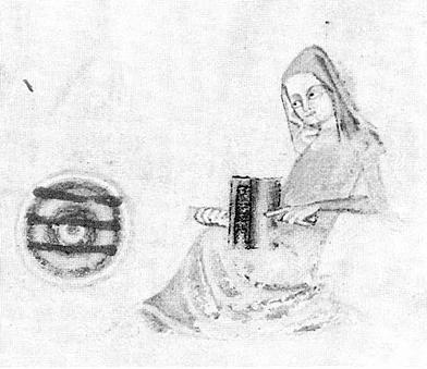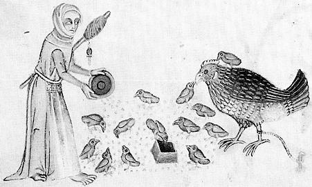 Figure 2. Woman with distaff feeding poultry c. 1330