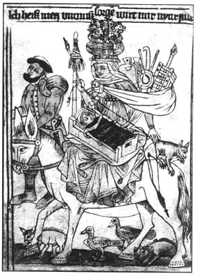 While using a wheel is more productive, it is not particularly portable. A drop spindle can be tucked through a belt or into a pouch, and distaffs were typically held under one arm, enabling women to spin almost anywhere—in Figure 2 from the Lutterel Psalter (c. 1330), the farm wife has not bothered to put her distaff and spindle down while she is out in the yard feeding her poultry. In Figure 3, a woodcut of jugglers on the road from a broadside ballad c. 1450, not only is the wife balancing their entire household goods, plus the poultry and the baby, but she is spinning while they travel. And possibly patting the cat. It's rather hard to tell :-) (At least she gets to sit down!) While I feel there may be a certain amount of exaggeration in this picture, I am inclined to believe the spinning... So while a household might have had a spinning wheel, there would certainly still be several drop spindles around, and little girls would have learned to spin on the rock well before they began to use a wheel. (A Great Wheel looks quite dangerous to me, especially in an age where a compound fracture could kill. Note that in Figure 1 the woman is turning it with a stick; I wouldn't want to be reaching half-blindly for a set of fast-spinning spokes, or allow a young child anywhere near it!)