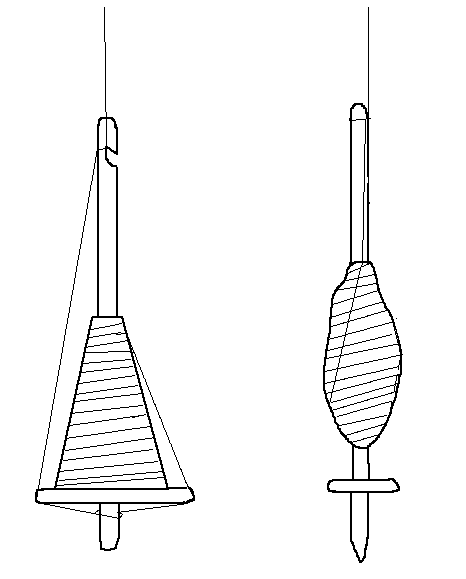 Figure 5 below shows a fully-dressed modern spindle and my conjecture for the dressing of a typical medieval spindle, both ready to spin.