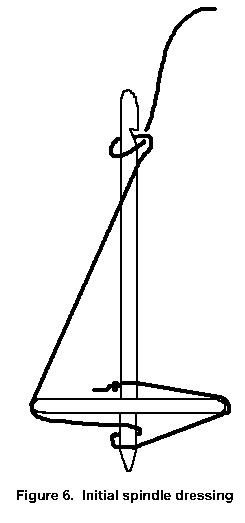 Although it is actually possible to twist a bit of wool into a short thread with your fingers, wrap this around the notch at the top of a spindle, and start to spin (personal experience), it's not easy and success depends very much on the type of wool you are trying to spin. The normal way to dress a bare spindle is to take 30cm or so of spun thread, and begin by tying one end around the spindle just above the whorl with a granny knot. The thread is then pulled down over the edge of the whorl, wrapped around the bottom end of the spindle, and brought all the way back up to the top of the spindle to the notch. A half-hitch pulled tight around the spindle then secures the thread in the notch. (The half-hitch is made by looping the thread once around the spindle, then passing the free end back under the thread coming up from the whorl as though you were going to tie a simple knot, but without doing the second pass under the thread loop.) See Figure 6 for a diagram of this.