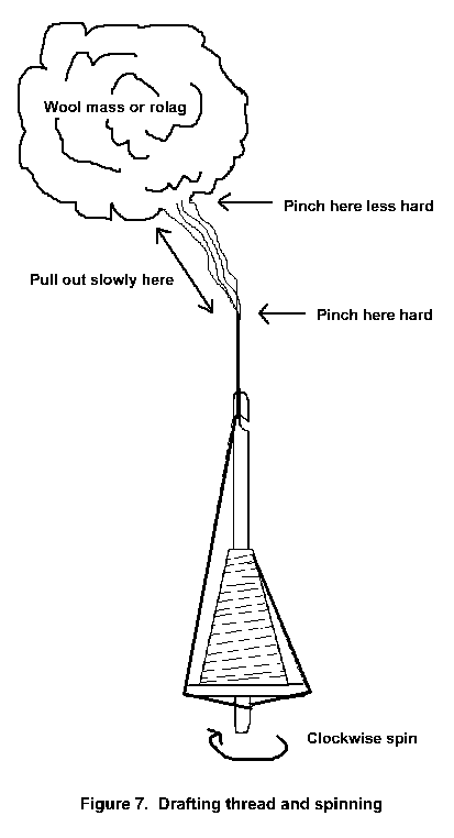Hold the top of the spindle between the thumb and first two fingers of your right hand, give it a good vigorous twist clockwise, and let go. The spindle and thread are now spinning.1 You will see the wool fibres start to twist around the thread where you are holding them in your left thumb and forefinger; as soon as they seem to have taken a good hold, pinch them firmly at this point with your right thumb and forefinger. Ease off on your left hand a bit and pull up gently with the left hand and down with your right hand so that a strand of fibres a few centimetres long is pulled out from the main mass/rolag. See Figure 7 for a diagram of this.