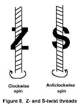 You may have wondered why I specified spinning clockwise. Spinning the thread clockwise gives it what is known as a Z-twist, as opposed to the S-twist produced by anticlockwise spinning (see Figure 8). Due to the wool scales' configuration, a Z-twist produces a slightly stronger thread than an S-twist, although the S-twist is a little softer. Unless you are planning to weave and want your thread for the warp (lengthways threads) on the loom, it probably does not matter which way you twist, as long as you are consistent. When plying thead (see below), you take two or more threads of the same twist, and spin them in the opposite direction. This is part of what makes the plied yarn stay together (the other is setting the twist in hot water).
