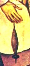 The final thing to note is the absence of a notch near the top of the spindle. This is particularly obvious in the middle picture. Of course, it could be that every picture of a medieval spindle I've seen so far (about twenty) just happens to show the exact back of the spindle so that the notch is invisible, but somehow I feel this is straining coincidence a little far.