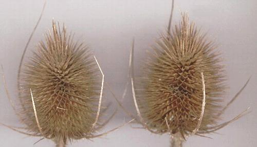The term "carding" comes from the latin word for "thistle," carduus. Teasels (Dipsacus fullonum L.), a member of the thistle family, were the earliest carding tool and continued to be used, long after they had been commercially abandoned for general wool carding, to raise the nap on cloth during the complicated fulling process in commercial production. Dry teasel seed heads such as would have been used in medieval times are shown in Figure 19, and a pair of modern carders in Figure 20. Carders are used in pairs, with the wool being transferred from one carder to the other several times as they are drawn across each other, and finally rolled off the carder to form a rolag. The difference between carding and combing is that the shorter fibres are not removed by carding, but instead blended in among the longer ones. This results in woolen thread, fuzzier and slightly weaker than worsted. Woolen thread was commonly used as the weft (crossways thread) in medieval weaving [Munro 2003].