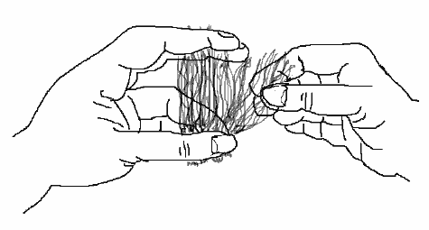 How to tease out fibres from staples is shown in Figure 21. For a teased mass of wool, you just pinch as small a clump as you can manage when you are pulling the fibres out, and once the staple is fully apart, keep pulling at it gently until you have separated as many strands as you can without starting to felt the wool. If your wool is very full of burrs and dirt, you may not be able to fully tease it successfully. In this case you will need to attack it vigorously with a hairbrush, which will give you some teased mass and some combed staples.